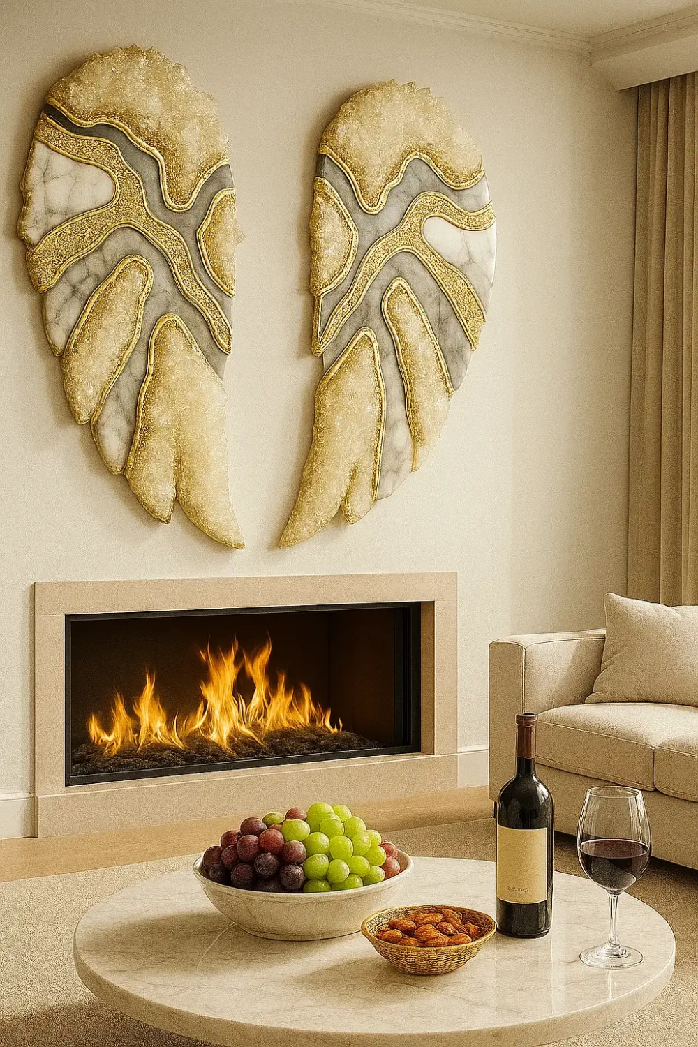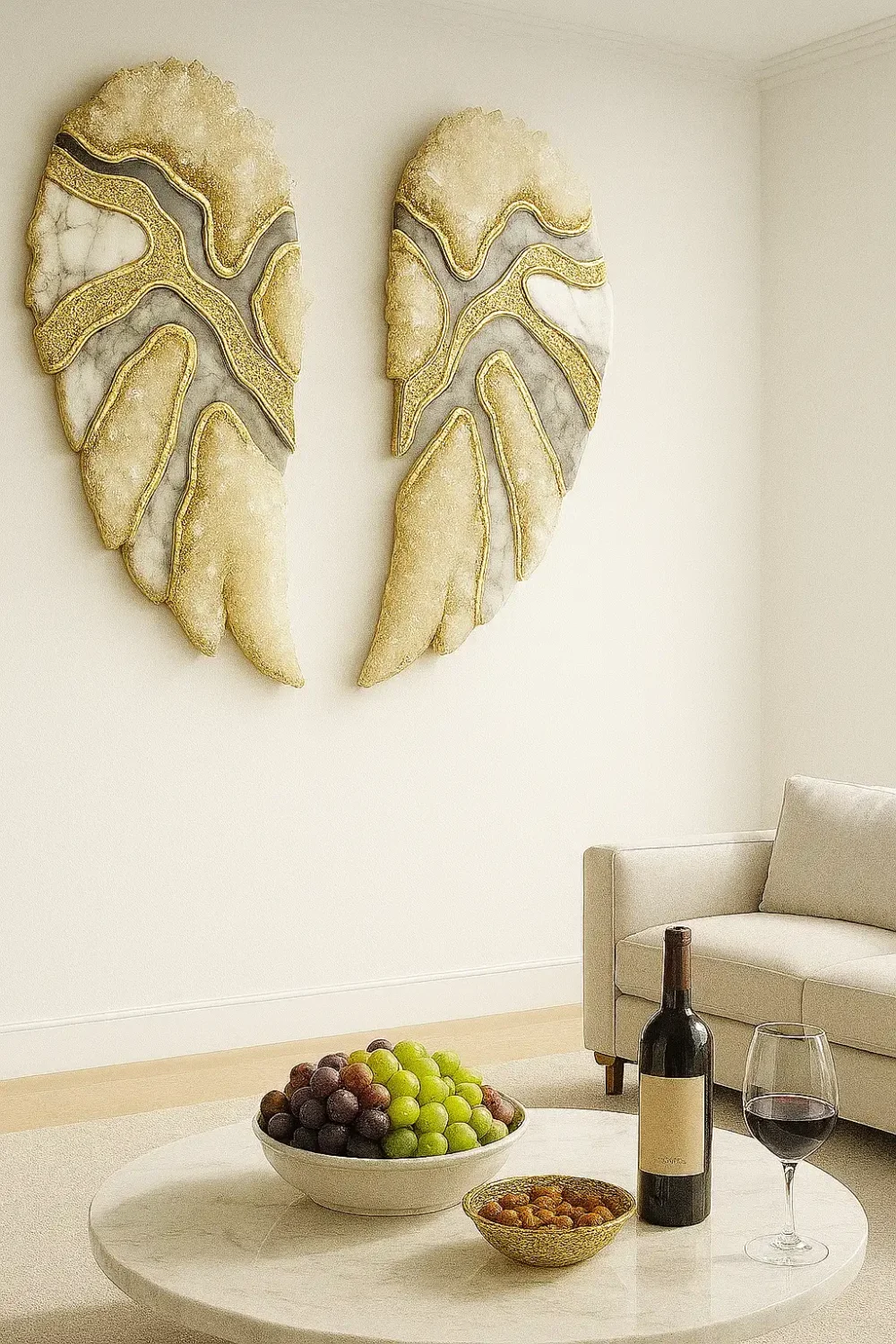 This breathtaking two-panel sculpture radiates purity, light, and spiritual serenity. Sculpted in a flowing angelic form, the White Angel Wings blend shimmering pearlescent white resin, clear quartz crystal clusters, and 24K gold leaf detailing to create a harmonious masterpiece of modern sacred art.